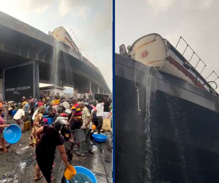 A diesel tanker overturned on the Apapa Bridge in Lagos,spilling it’s contents onto the busy roadway