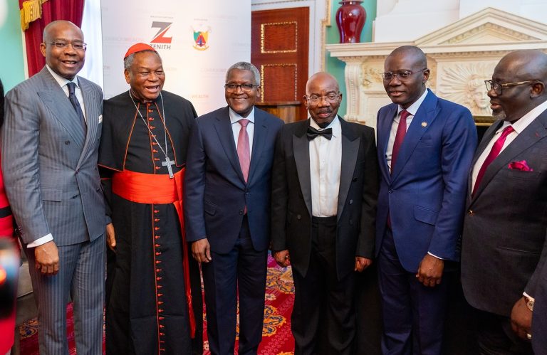 L-R: Chairman, Access Holdings Plc, Aigboje Aig-Imoukhuede, CFR; His Eminence John Cardinal Onaiyekan; President of Dangote Group, Alhaji Aliko Dangote, GCON; Founder and Chairman of Zenith Bank Plc, Jim Ovia, CFR; Governor of Lagos State, Mr. Babajide Sanwo-Olu; and Governor of Delta State, Rt.Hon. (Elder) Sherrif Oborevwori, during the admission of Jim Ovia to the Freedom of the City of London in the United Kingdom, on Monday.
