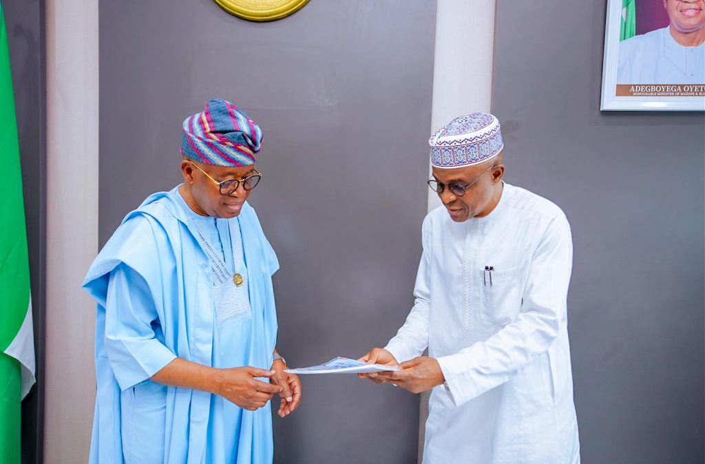 : L-R: Minister of Marine Blue Economy, Adegboyega Oyetola; Managing Director/Chief Executive Officer, Nigerian Ports Authority (NPA), Dr Abubakar Dantsoho when the NPA boss visited the office of the Minister in Abuja…recently