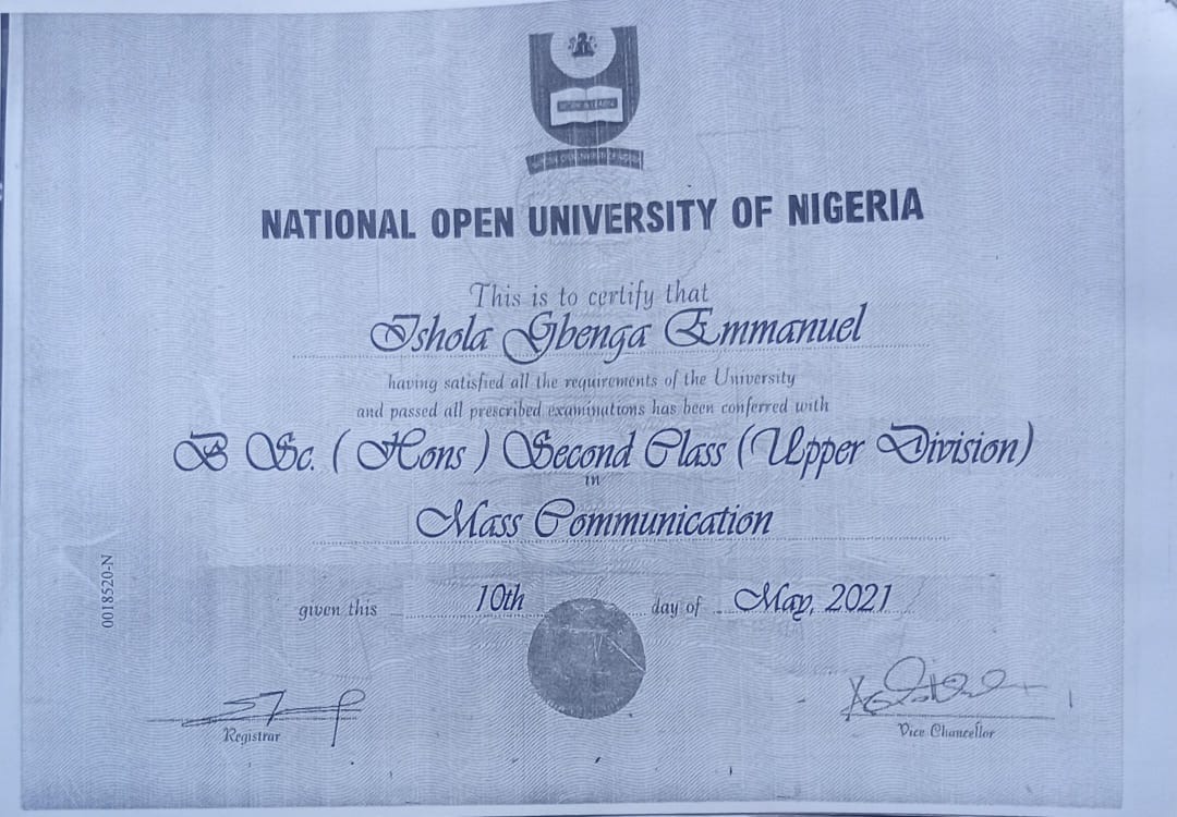 However in 2022 he submitted the NOUN certificate with number 0018520-N, to the Kwara council of the NUJ, with a B.Sc. (Hons) Second Class Upper Division in Mass Communication from NOUN.